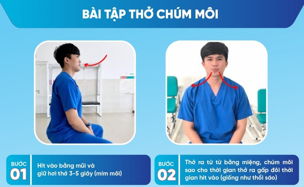 Thở chúm môi: Hít vào chậm bằng mũi, sau đó chúm môi lại như đang huýt sáo và thở ra chậm gấp đôi thời gian hít vào. Cách này giúp đường thở mở lâu hơn, tống được nhiều khí cặn ra ngoài.